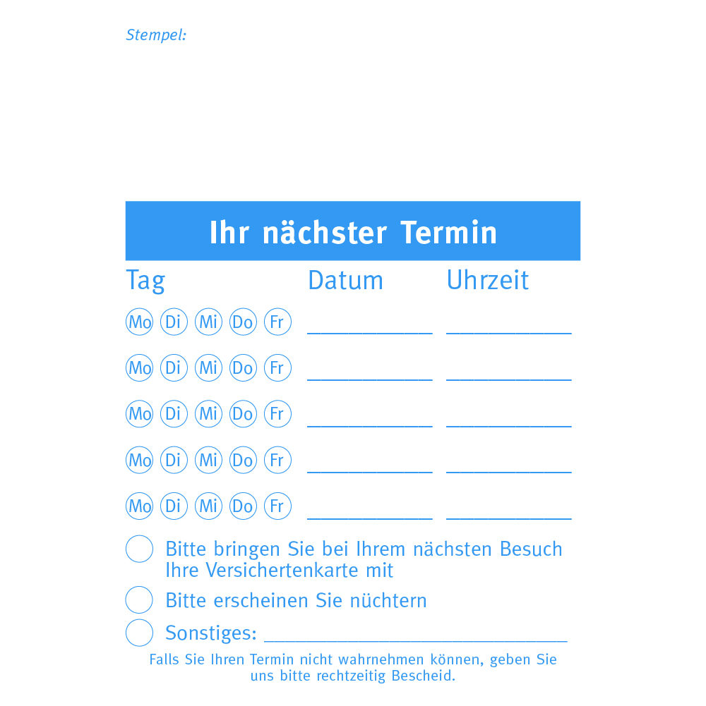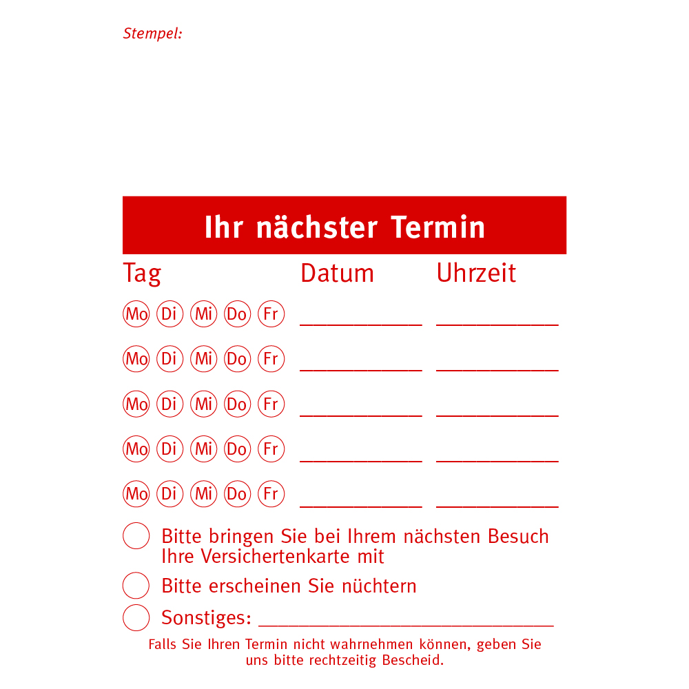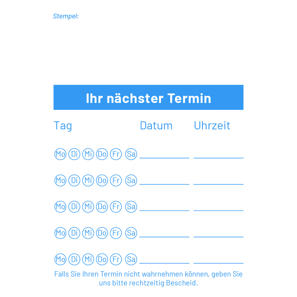 Die Anwendung ist denkbar einfach: Ihre Mitarbeiter notieren den nächsten Termin schnell und übersichtlich auf einem Blatt, das direkt an den Patienten ausgegeben wird – perfekt, um als Erinnerung am Kühlschrank zu dienen. Wählen Sie zwischen den Varianten in Rot und Blau oder entscheiden Sie sich für Ihr eigenes Layout – ganz nach Ihrem Geschmack. Profitieren Sie von einer effizienten, benutzerfreundlichen Terminverwaltung und steigern Sie die Zufriedenheit Ihrer Patienten!