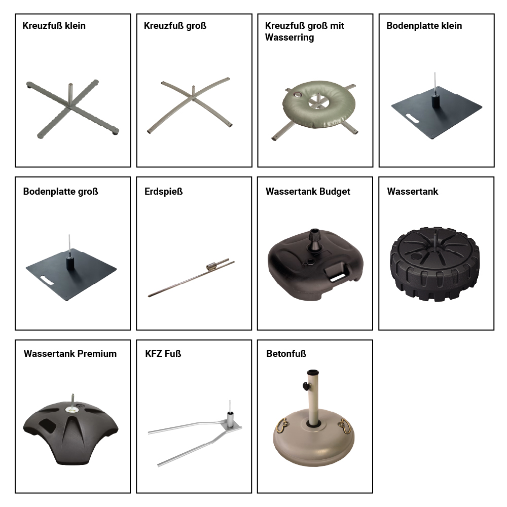 Damit die Fahne stabil und sicher steht – egal ob auf Asphalt, Rasen, Sand oder Schnee - ist die Wahl des richtigen Standfußes entscheidend. Für die Beachflag Drop sind verschiedene Kreuzfüße, Bodenplatten, ein Wassertank, ein KFZ-Fuß und ein Betonfuß erhältlich, wenn die Fahne auf den Boden gestellt werden soll sowie ein Erdspieß für die Verankerung im Boden. Bei Kreuzfüßen und Bodenplatten empfiehlt es sich je nach Einsatzort und Größe der Beachflag, für eine optimale Stabilität einen Wasserring zur Beschwerung zu verwenden.